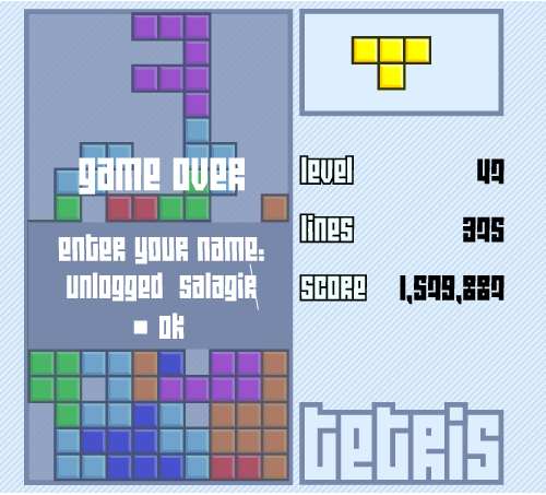 Hello. This page is here to show all the records of my (good) tetris games on the flash game in sogamed.